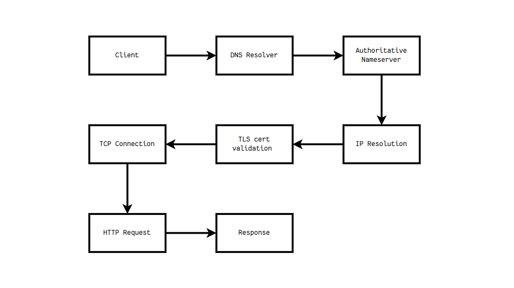In this flow, there are 4+ mandatory intermediaries (DNS, CA, ISP, origin server) and more than 3 trust assumptions along the way (DNS hierarchy, CA system, server identity).