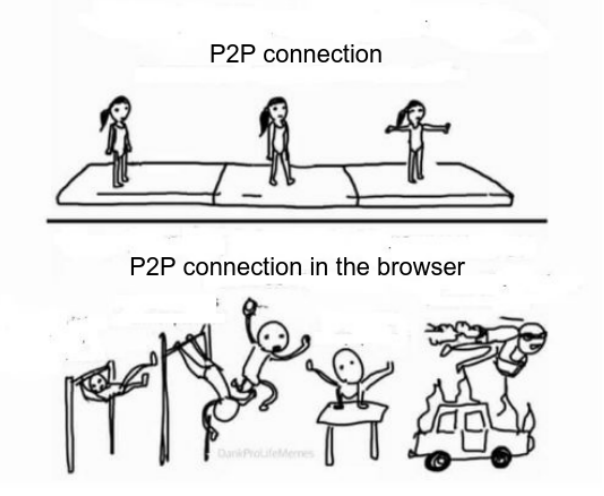 Think about that: connecting two browsers directly is harder and slower than connecting both browsers to a server, despite the direct path being shorter and requiring less infrastructure. This of course isn't WebRTC's fault though but rather the inevitable consequence of building P2P on an architecture optimized for client-server. NATs, firewalls, and ISP routing policies all assume client-server topology. P2P is swimming upstream while the architecture actively pushes water against it.
